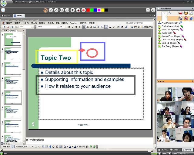 2.在多人會議的環(huán)境下,vzRoom同時(shí)支持多種實(shí)時(shí)信息分享,包括網(wǎng)頁、相片、文件、圖表和簡報(bào)等,配合內(nèi)置畫筆功能,方便解說。