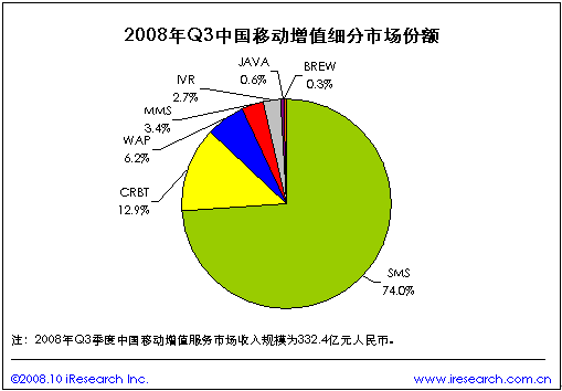 根據(jù)iResearch艾瑞咨詢最新出版的《2008年第三季度中國移動增值行業(yè)發(fā)展報告》數(shù)據(jù)顯示,2008年第三季度中國移動增值服務(wù)市場規(guī)模達332.4億元,同比增長40.2%.其中短信市場規(guī)模以74.0%的比例位居第一,CRBT和WAP分別以12.9%和6.2%的份額居第二、第三。