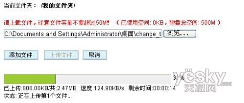 相對而言189在網(wǎng)絡硬盤功能方面則優(yōu)越很多,除了硬盤空間的容量外,支持上傳文件的進度條顯示,而且上傳速率也不錯,基本穩(wěn)定保持在120KB/s。