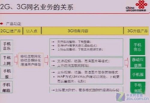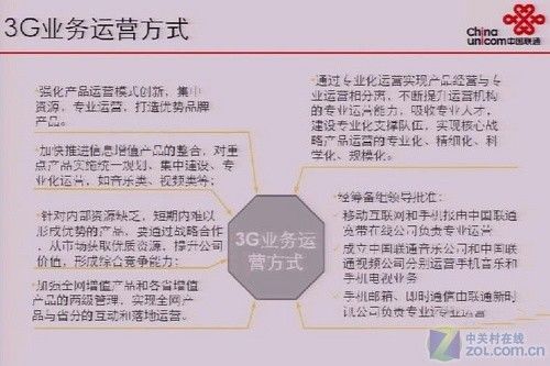 前不久,有論壇網友曝光了幾張聯通內部3G培訓所用的PPT截圖,其中不僅提到了聯通3G業(yè)務的運營方式,2G/3G同名業(yè)務的關系,還再一次強調了聯通將重點推廣的3類九項主要3G業(yè)務。這和筆者前段時間為大家曝光的《官方Flash動畫:解析聯通3G九大特色業(yè)務》所提到的聯通9大特色3G業(yè)務保持一致。