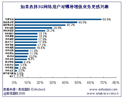 據(jù)易觀Enfodesk《中國3G市場用戶調(diào)研報(bào)告2009》研究發(fā)現(xiàn),可視電話成為最受用戶歡迎的增值業(yè)務(wù),除此之外,高速移動寬帶業(yè)務(wù)和高清晰語音受用戶選擇比例也較高,分別達(dá)到49.5%和40.2%。與此相反的是,手機(jī)社區(qū)、手機(jī)博客和殺毒/安全業(yè)務(wù)受歡迎程度最小。