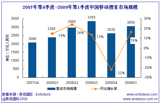 2009年第1季中國移動搜索市場收入達(dá)3050萬,環(huán)比增長16%
