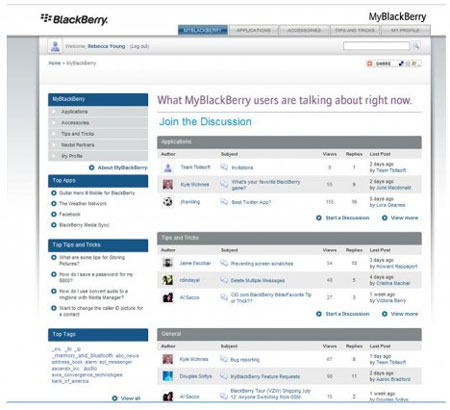 從某種程度而言,MyBlackBerry并不是一個真正的社交網(wǎng)站,而更像一個用戶留言板。網(wǎng)站具有一定的針對性,允許使用同型號設(shè)備的用戶進(jìn)行交流。例如,使用BlackBerry