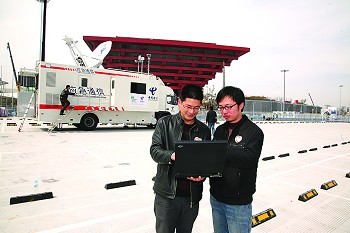 中國電信的應(yīng)急衛(wèi)星通信車抵達(dá)中國館,為世博會(huì)開幕護(hù)航。
