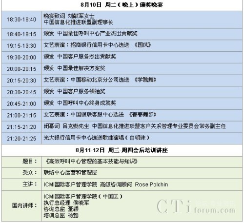 CTI論壇(ctiforum)8月3日消息(記者 潘婷婷):“第八屆中國呼叫中心產(chǎn)業(yè)高峰論壇暨第八屆中國最佳呼叫中心及最佳管理人頒獎大會”定于2010年8月10日在上海國際貴都大飯店召開。此次大會是由中國信息化推進聯(lián)盟客戶關(guān)系管理專業(yè)委員會主辦,ICMI國際客戶管理學(xué)院(中國區(qū))承辦。通過本次大會,與會者將獲得中國最佳呼叫中心實踐經(jīng)驗和最佳解決方案的分享,與業(yè)界精英共話呼叫中心和客戶關(guān)系管理的未來。