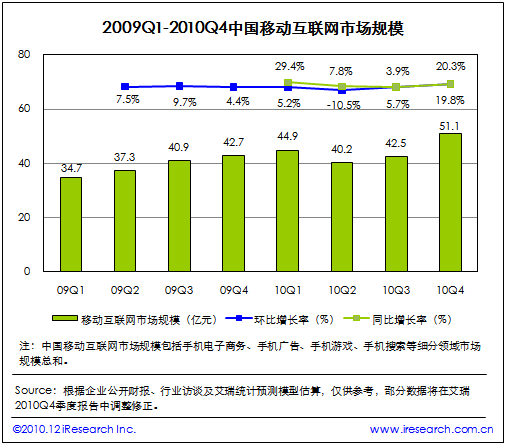根據(jù)艾瑞咨詢即將發(fā)布的2010年第四季度中國移動互聯(lián)網(wǎng)市場監(jiān)測數(shù)據(jù)顯示,2010Q4中國移動互聯(lián)網(wǎng)市場整體規(guī)模達(dá)到51.1億,同比增長19.8%,環(huán)比增長20.3%。艾瑞咨詢分析認(rèn)為,本季度電信運營商對計費通道治理開始收尾,移動增值市場整體復(fù)蘇。同時手機電子商務(wù)、手機游戲業(yè)務(wù)領(lǐng)域取得良好市場表現(xiàn),受手機應(yīng)用商店、位置簽到服務(wù)等新型手機業(yè)務(wù)創(chuàng)新的帶動,移動互聯(lián)網(wǎng)規(guī)?傮w攀升,投融資比重增加。