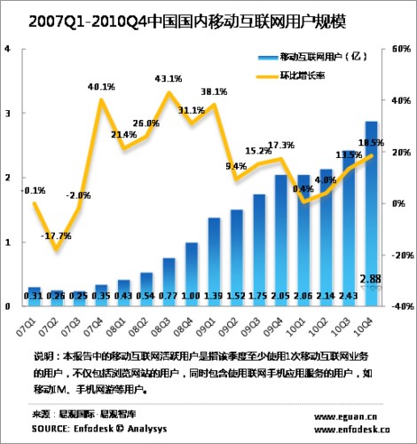 據(jù)Enfodesk易觀智庫最新發(fā)布的數(shù)據(jù)顯示,2010年第4季度中國國內(nèi)移動互聯(lián)網(wǎng)用戶規(guī)模達2.88億人,環(huán)比增長18.52%,相比去年同期呈現(xiàn)41.48%的增長速度。
