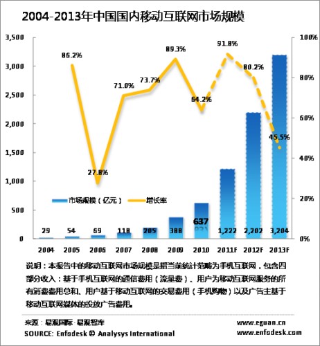2010年中國國內(nèi)移動互聯(lián)網(wǎng)市場規(guī)模達到637億元,較2009年上漲64.2%,增速放緩。除去流量費之外,移動互聯(lián)網(wǎng)服務(wù)收入達到342億元。