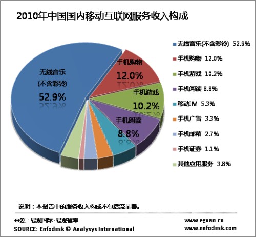 從收入構(gòu)成看來,無線音樂、手機游戲、手機閱讀逐漸成為三大主要移動互聯(lián)網(wǎng)娛樂應用,手機購物增速明顯。