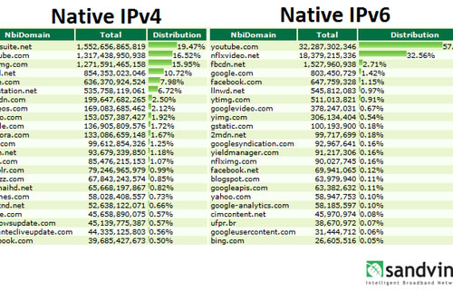 根據(jù)Sandvine的采樣數(shù)據(jù),YouTube服務(wù)貢獻(xiàn)了最多的IPv6流量,約為57%。緊接著是Netflix,流量貢獻(xiàn)約為32%。Facebook及其內(nèi)容分發(fā)網(wǎng)絡(luò)分別貢獻(xiàn)了1.15%和2.7%的流量,谷歌主頁(yè)則貢獻(xiàn)了1.42%的流量。(盧鑫)