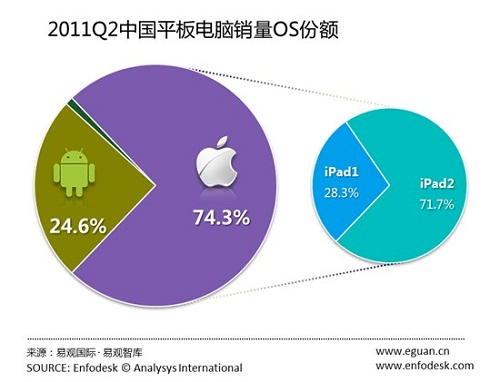 2011年第2季度中國(guó)市場(chǎng)銷(xiāo)售的平板電腦中,iOS系統(tǒng)占比最高,Android系統(tǒng)雖然產(chǎn)品數(shù)量占優(yōu),但占比僅有24.64%。