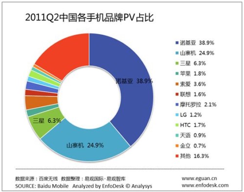 CTI論壇(ctiforum)8月15日消息(記者 潘婷婷): 根據(jù)《移動互聯(lián)網(wǎng)發(fā)展趨勢報告》顯示,在2011年第2季度手機(jī)品牌PV占比中,諾基亞市場份額環(huán)比下降3%,跌至39%。其次是山寨機(jī),占據(jù)了25%的市場份額。三星位列第三。