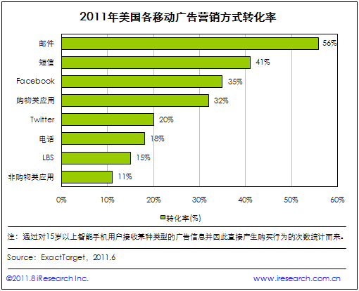 iResearch艾瑞咨詢整理ExactTarget調(diào)研數(shù)據(jù)時(shí)發(fā)現(xiàn):2011年在驅(qū)動(dòng)美國(guó)手機(jī)用戶產(chǎn)生購(gòu)買的移動(dòng)廣告營(yíng)銷方式中,電子郵件營(yíng)銷的轉(zhuǎn)化率最高,達(dá)到56%,短信、Facebook、購(gòu)物類手機(jī)應(yīng)用(如Amazon、eBay、Groupon)以41%、35%、32%的轉(zhuǎn)化率依次位居二、三、四位。