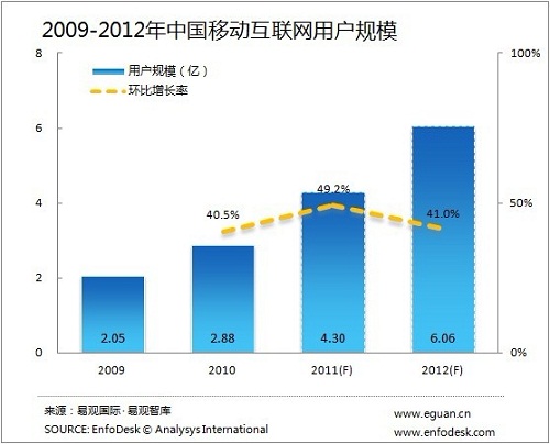基于EnfoDesk易觀智庫對(duì)移動(dòng)互聯(lián)網(wǎng)的持續(xù)研究,預(yù)計(jì)2012年市場(chǎng)用戶規(guī)模及從移動(dòng)互聯(lián)網(wǎng)市場(chǎng)規(guī)模保持相對(duì)穩(wěn)定的增長,移動(dòng)互聯(lián)網(wǎng)用戶數(shù)有機(jī)會(huì)在2012年突破6億,并且超過互聯(lián)網(wǎng)用戶數(shù)量,智能終端、移動(dòng)互聯(lián)網(wǎng)應(yīng)用繼續(xù)延續(xù)2011年的增長速度。