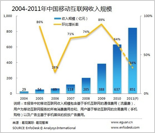 2011年中國移動(dòng)互聯(lián)網(wǎng)市場(chǎng)規(guī)模達(dá)851億