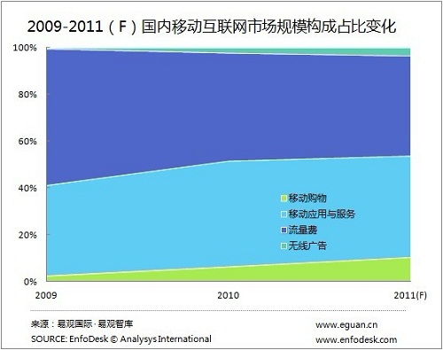 對(duì)比2009年到2011年市場(chǎng)規(guī)模的構(gòu)成變化可以了解到,2011年移動(dòng)購物與無線廣告在規(guī)模占比上都有了很大的提高,尤其是移動(dòng)購物,從2009年的規(guī)模占比3%增長到11%,用戶對(duì)通過移動(dòng)終端購物的習(xí)慣整逐步被得到培養(yǎng),另外值得注意的是2011年移動(dòng)互聯(lián)網(wǎng)流量費(fèi)占比低于50%,已經(jīng)從2009的58%減少至42%。