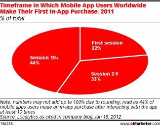 移動(dòng)應(yīng)用分析公司Localytics提供的數(shù)據(jù)顯示,增加應(yīng)用粘性對(duì)用戶重復(fù)訪問應(yīng)用以及經(jīng)常性參與應(yīng)用內(nèi)置支付非常重要。舉例而言,連續(xù)數(shù)天玩一款手機(jī)游戲的玩家,比不經(jīng)常玩這款游戲的玩家更可能購(gòu)買游戲附加的內(nèi)容或功能。Localytics的研究結(jié)果表明,忠實(shí)的應(yīng)用用戶比平均用戶使用應(yīng)用內(nèi)置支付高出25%。Localytics的數(shù)據(jù)還表明,44%的智能手機(jī)用戶只有與應(yīng)用互動(dòng)10次以上,才會(huì)使用應(yīng)用內(nèi)置支付。該調(diào)查還顯示,在應(yīng)用發(fā)布12天開始,便會(huì)有用戶使用應(yīng)用內(nèi)置支付。
