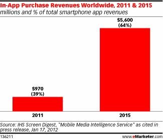 IHS Screen Digest預(yù)計(jì),應(yīng)用內(nèi)置支付將成為移動(dòng)應(yīng)用營(yíng)收的新標(biāo)準(zhǔn)。游戲開發(fā)商共同通過向用戶提供免費(fèi)應(yīng)用下載服務(wù),然后向用戶進(jìn)入新層次內(nèi)容收取費(fèi)用已證明這種“免費(fèi)增值”模式非常的成功。IHS Screen Digest預(yù)計(jì),到2015年,應(yīng)用內(nèi)置支付將占據(jù)智能手機(jī)應(yīng)用營(yíng)收總額的64%,遠(yuǎn)超過2011年的39%。