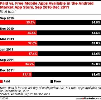 通過對(duì)2010年9月至2011年12月Android Market應(yīng)用商店的分析,進(jìn)一步表明了對(duì)免費(fèi)應(yīng)用模式的依賴性。根據(jù)第三方應(yīng)用程序跟蹤服務(wù)AndroLib提供的數(shù)據(jù),2010年9月Android Market應(yīng)用商店下載的大約65%應(yīng)用均為免費(fèi)應(yīng)用;在2011年12月,這一比例已經(jīng)提升至69%。
