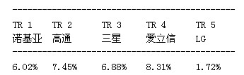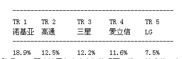 第一階段;湯森路透將每一項(xiàng)專利同歐洲電信標(biāo)準(zhǔn)協(xié)會截至2011年11月18日的LTE規(guī)范進(jìn)行比較,確定專利的重要性。第二階段涉及先有技術(shù)檢查,即審查在美國和歐洲申請專利過程中的先有技術(shù)參考文獻(xiàn)。湯森路透利用先有技術(shù)參考文獻(xiàn)評估每項(xiàng)專利的新穎性并給出新穎性評級。湯森路透發(fā)現(xiàn),擁有屬于LTE標(biāo)準(zhǔn)范疇的基本與新穎專利的領(lǐng)先廠商有諾基亞、高通、三星、愛立信和LG。結(jié)果如下: