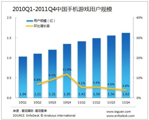 CTI論壇(ctiforum)2月27消息(記者 潘婷婷): 根據(jù)EnfoDesk易觀智庫產(chǎn)業(yè)數(shù)據(jù)庫最新發(fā)布的《2011年第4季度中國手機游戲市場季度監(jiān)測》數(shù)據(jù)顯示,中國手機游戲用戶規(guī)模穩(wěn)步增長,截止2011年第4季度達(dá)1.62億,環(huán)比增長3.83%。