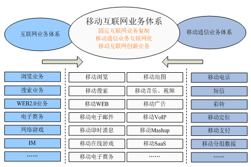 根據(jù)工信部相關(guān)信息,移動互聯(lián)網(wǎng)的業(yè)務體系主要包括三大類,如下圖所示:一是固定互聯(lián)網(wǎng)的業(yè)務向移動終端的復制,從而實現(xiàn)移動互聯(lián)網(wǎng)與固定互聯(lián)網(wǎng)相似的業(yè)務體驗,這是移動互聯(lián)網(wǎng)業(yè)務的基礎(chǔ)。二是移動通信業(yè)務的互聯(lián)網(wǎng)化,如Skype推出的移動VOIP業(yè)務、中國移動的飛信業(yè)務等。三是結(jié)合移動通信與互聯(lián)網(wǎng)功能而進行的有別于固定互聯(lián)網(wǎng)的業(yè)務創(chuàng)新,這是移動互聯(lián)網(wǎng)業(yè)務發(fā)展方向。對創(chuàng)業(yè)者而言,移動互聯(lián)網(wǎng)的業(yè)務創(chuàng)新關(guān)鍵是如何將移動通信的網(wǎng)絡(luò)能力與互聯(lián)網(wǎng)的網(wǎng)絡(luò)與應用能力進行聚合,從而創(chuàng)新出適合移動終端的互聯(lián)網(wǎng)業(yè)務,如移動Web2.0業(yè)務,如微博、移動位置類互聯(lián)網(wǎng)業(yè)務等。
