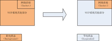 2、程序配置用于 VOIP 業(yè)務(wù)的網(wǎng)絡(luò)連接(Socket),告知系統(tǒng),在程序進(jìn)程被調(diào)度到“掛起(Suspended)”狀態(tài)時(shí)該特殊的網(wǎng)絡(luò)連接需要被系統(tǒng)接管,因此,此時(shí)網(wǎng)絡(luò)連接仍然是活動(dòng)的。當(dāng)網(wǎng)絡(luò)連接有新的數(shù)據(jù)到達(dá)的時(shí)候,程序?qū)摹皰炱穑⊿uspended)” 狀態(tài)被喚醒到“后臺(tái) (Background)”狀態(tài),如果是個(gè)來電事件,VOIP應(yīng)用則發(fā)起一個(gè)本地提醒事件,此時(shí)用戶可以在設(shè)備的界面上看到來電提醒,如果用戶選擇接聽來電,則 VOIP 應(yīng)用被調(diào)度到前端的“活動(dòng) (Active)”狀態(tài)直接與用戶交互,否則,回退到低電的“掛起(Suspended)”狀態(tài)。下圖可以看到左圖是傳統(tǒng)的 VOIP 應(yīng)用,在“待機(jī)”狀態(tài)下整個(gè)程序都運(yùn)行在耗電的“后臺(tái) (Background)”狀態(tài),右圖是蘋果的 VOIP 實(shí)現(xiàn),僅僅網(wǎng)絡(luò)連接運(yùn)行在耗電的“后臺(tái) (Background)”狀態(tài)。其余系統(tǒng)部分運(yùn)行在低電的“掛起(Suspended)”狀態(tài)。
