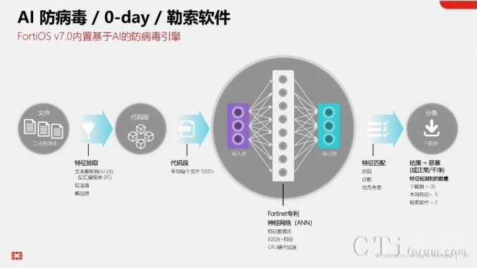 目前,AI技術(shù)已深度融入Fortinet的數(shù)十種產(chǎn)品與方案中。在最新版的統(tǒng)一網(wǎng)絡(luò)安全操作系統(tǒng)FortiOS 7.6中,就已經(jīng)內(nèi)置了由FortiGuard AI實(shí)驗(yàn)室研發(fā)的基于AI的防病毒引擎。該引擎運(yùn)用神經(jīng)網(wǎng)絡(luò)技術(shù),學(xué)習(xí)并區(qū)分海量病毒文件與正常文件,通過(guò)分類(lèi)打分的方式,實(shí)現(xiàn)對(duì)未知文件與病毒的精準(zhǔn)判斷,無(wú)需依賴(lài)傳統(tǒng)的病毒特征庫(kù)。因此,F(xiàn)ortinet的FortiGate等產(chǎn)品在防病毒方面擁有雙引擎加持,既有傳統(tǒng)的基于病毒特征庫(kù)的防病毒引擎,又有基于AI的下一代防病毒引擎(Anti-virus NGAV),雙重保障,安全無(wú)憂(yōu)。