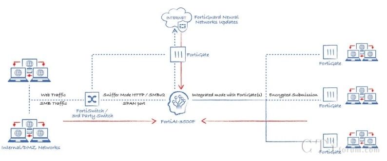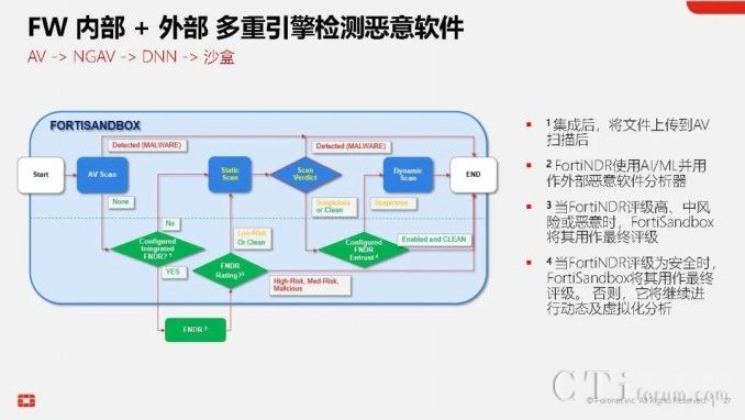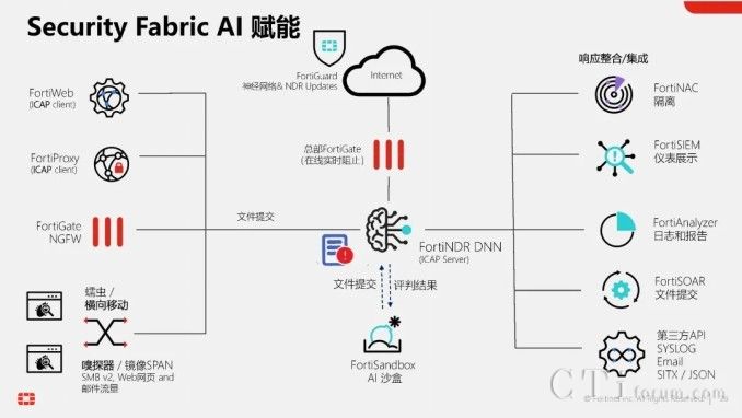 此外,AI技術(shù)還貫穿于Fortinet的多個(gè)產(chǎn)品與功能中,形成高效的工作流。以威脅檢測(cè)與響應(yīng)為例,當(dāng)FortiGate的雙引擎也無(wú)法確定某個(gè)文件的合法性時(shí),它可以將該文件提交給FortiNDR進(jìn)行深度分析,利用云端深度神經(jīng)網(wǎng)絡(luò)AI進(jìn)行0 Day攻擊、勒索軟件等深層次分析。若仍無(wú)法確定,還可進(jìn)一步提交給FortiSandbox,在虛擬機(jī)環(huán)境中進(jìn)行模擬操作,進(jìn)行更為深入的檢測(cè)。在這一系列流程與技術(shù)的支持下,F(xiàn)ortinet的威脅檢測(cè)與響應(yīng)能力已達(dá)到業(yè)界頂尖水平,向滿(mǎn)分100分邁進(jìn)。