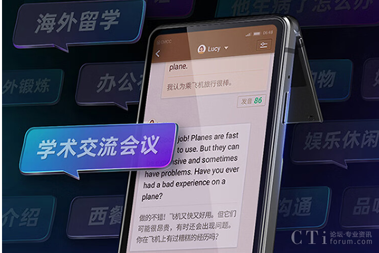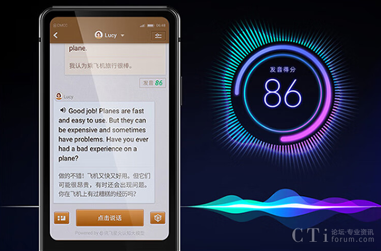 AI教練可以隨時(shí)隨地和用戶一對(duì)一地聊天,并會(huì)將聊天內(nèi)容用中英文對(duì)照的方式顯示在屏幕上,同時(shí)還會(huì)對(duì)用戶的口語發(fā)音進(jìn)行智能打分。