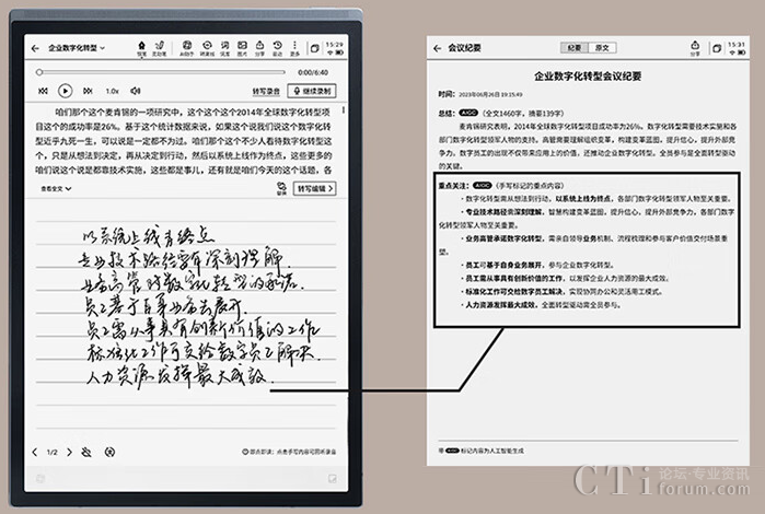 其中會(huì)議紀(jì)要功能,可將科大訊飛智能辦公本的語音實(shí)時(shí)轉(zhuǎn)寫功能與墨水屏紙感書寫相結(jié)合,并且可以對(duì)會(huì)議記錄內(nèi)容形成一份精簡的會(huì)議紀(jì)要,有助于快速回溯會(huì)議內(nèi)容。