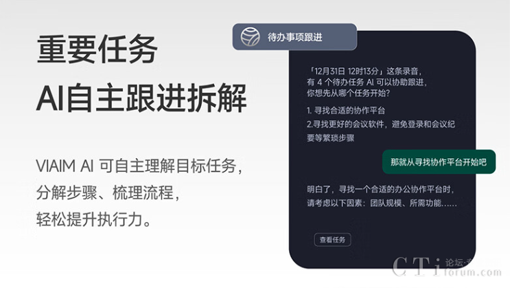 借助VIAIM AI智慧大腦,可一鍵提取會(huì)議摘要,海量會(huì)議內(nèi)容瞬間搞定,無需費(fèi)時(shí)手動(dòng)梳理;待辦事項(xiàng)自動(dòng)匯總,并可根據(jù)需求生成具體待辦子任務(wù),在執(zhí)行的過程中,科大訊飛降噪會(huì)議耳機(jī)Nano+會(huì)自主理解并分解目標(biāo)任務(wù)、理清流程,輕松提升執(zhí)行力。