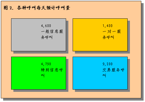 。。為了對此進(jìn)行說明,假設(shè)呼叫中心每天可預(yù)計(jì)處理大約20000個(gè)呼叫。這包含了上文所述的四種呼叫。將有50%以上呼叫中心接到的呼叫是關(guān)于基本服務(wù)請求或性質(zhì)請求。這種預(yù)計(jì)呼叫量不包括預(yù)計(jì)呼叫增長量,因?yàn)闆]有以往信息不能估計(jì)出增長情況。而在呼叫中心運(yùn)行初期通常是沒有這些信息的。應(yīng)在執(zhí)行計(jì)劃中進(jìn)行增長假設(shè)分析,保證系統(tǒng)容量在執(zhí)行服務(wù)市場計(jì)劃后可以應(yīng)付相應(yīng)的增長水平。