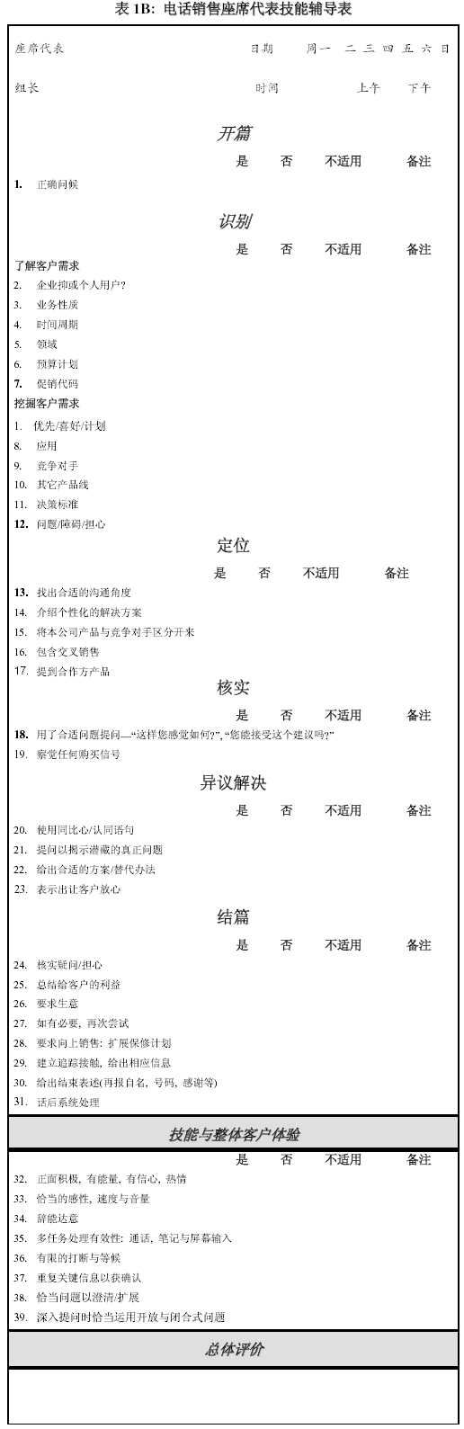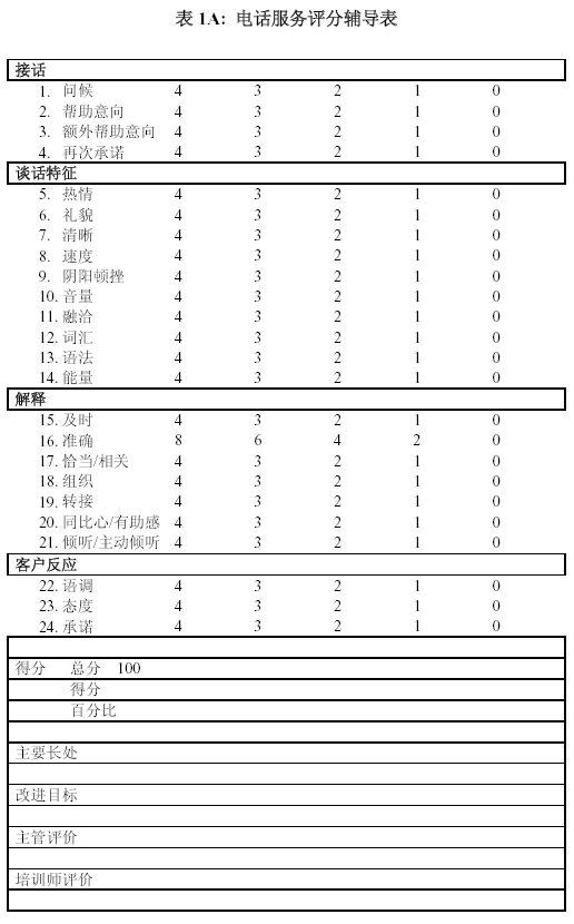 。。無論是客戶服務(wù)還是電話銷售, 輔導(dǎo)表所測定的內(nèi)容一定要和培訓(xùn)內(nèi)容一致起來. 沒有培訓(xùn)過的項(xiàng)目, 不要要求座席代表自行理解.