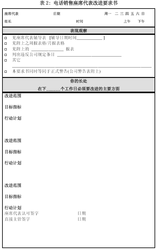 。。這里所列的兩張輔導(dǎo)表應(yīng)該是主管、質(zhì)檢與輔導(dǎo)師最常見的工具。那種無法對通話內(nèi)容進(jìn)行具體、詳盡分析,或者輔導(dǎo)人自己也定義不清, 不能給出示范與明確改進(jìn)方向的管理絕對不是專業(yè)的管理。在這類輔導(dǎo)表之外,可以根據(jù)通話的評價和其它一些紀(jì)律觀察,設(shè)計(jì)一種“改進(jìn)要求表”,將根據(jù)表現(xiàn)觀察后制定的改進(jìn)要求詳細(xì)列出。如果公司有書面警告一類的程序要求,也可揉合進(jìn)改進(jìn)要求書。