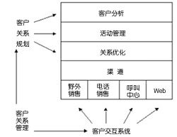 真正的CRM解決方案是一個復雜的聯(lián)合體,它由許多組件(即分析工具、活動管理與事件引發(fā)等)與許多需要用來達到一對一的營銷能力(如間接管理、基于規(guī)章制度的工作流管理以及真正的渠道管理等)的新組件共同組成。此外,在非客戶聯(lián)系系統(tǒng)(如企業(yè)資源規(guī)劃與操作)與客戶聯(lián)系系統(tǒng)之間必須有接口。最后,在企業(yè)內建立一套完整的便于知識管理的反饋循環(huán)系統(tǒng)也很必要。
