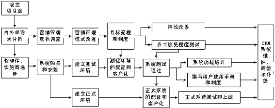 一個CRM系統(tǒng)的建設(shè)所經(jīng)過的歷程,可以用圖1所示。漢普管理咨詢(中國)有限公司的CRM系統(tǒng)的實(shí)施就是按照這個路線進(jìn)行的,主要從管理的調(diào)整和信息系統(tǒng)的建設(shè)兩個方面著手。