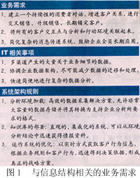 為了獲得真正智能化的企業(yè)客戶管理,信息結(jié)構(gòu)必須與商業(yè)智能無縫集成。圖1描述了與信息結(jié)構(gòu)相關(guān)的業(yè)務(wù)需求。這種需求和結(jié)構(gòu)引起的信息技術(shù)問題使得實(shí)現(xiàn)真正的集成化迫在眉睫。