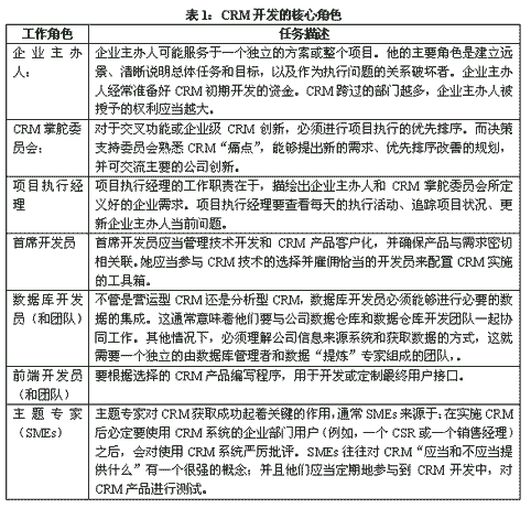 表1列出了CRM開發(fā)團(tuán)隊中的核心工作功能。在開始著手一個開發(fā)項目之前,確保已經(jīng)考慮了下面的每一種角色;并且從公司內(nèi)部和外部來理解勝任這些角色所必需的技能。