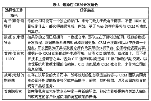 根據(jù)你的CRM項目的廣泛性和復(fù)雜性,對于在表2中列出的工作角色,你可以有選擇地在CRM開發(fā)中添加。