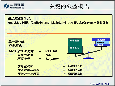 華夏證券經(jīng)紀業(yè)務(wù)總部的姚磊作為唯一的成功應(yīng)用案例代表,主要是和與會的金融機構(gòu)分享在客戶關(guān)系管理規(guī)劃方面的一些成功經(jīng)驗。華夏證券認為,對于證券公司的經(jīng)紀業(yè)務(wù)來講,客戶關(guān)系管理的主要目標(biāo)應(yīng)該是把客戶關(guān)系管理系統(tǒng)的核心功能融入開戶、交易、服務(wù)、咨詢等四個與客戶互動的過程之中,比如:客戶資料規(guī)戶整合形成統(tǒng)一的客戶號,管理客戶交易偏好和產(chǎn)品偏好上的變化,配合多種渠道建立一對一銷售流程,客戶終身價值管理。在風(fēng)險控制方面,華夏證券同樣貢獻了寶貴的經(jīng)驗,在這方面他們認為最重要的方面是要做好高層領(lǐng)導(dǎo)的灌輸和培訓(xùn)工作,讓企業(yè)的高層領(lǐng)導(dǎo)對于客戶關(guān)系管理有一個正確的理解,從而對于項目的投資有一個合理的預(yù)期和實證,通俗一點說,就是首先為整個項目找一個合適的發(fā)起人。第二點要注意,要有專業(yè)的項目管理隊伍,這其實就是集成商選擇方面的風(fēng)險。除此之外,還要對項目要有一個明確的定義,關(guān)注每一步提交的結(jié)果,在項目過程中就隨時發(fā)現(xiàn)問題、解決問題。
