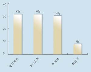 在問到實施周期上,有9家表示希望在3個月內完成,占到47.4%,有6家接受3~6個月的周期,超過6個月的周期已經(jīng)顯得太長。在問到CRM的實施效果上,有9家認為對公司運營效率有很大提高,8家認為作用一般,只有2家認為沒有作用。表明基本上企業(yè)認可CRM的作用。在問到是否有專門人員負責CRM時,有6家表示有專門部門,有6家有專門人員,合計占62%,說明企業(yè)非常重視CRM的應用。