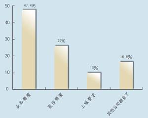 在問到對CRM的熟悉程度方面,有12家表示熟悉,占到63.2%,另有7家表示不熟悉,說明許多企業(yè)已經(jīng)對CRM有一定了解,不過也仍有相當大的市場空間。其中有8家建立了CRM系統(tǒng),占到42%,計劃建立的有9家,占到47.4%,而有2家表示短期不會建立。從調查發(fā)現(xiàn),幾乎所有受訪者都接受和認同CRM,盡管有一些企業(yè)還不熟悉,但在調查問卷中對此表現(xiàn)出極大的興趣。在CRM的采購動機上,有9家表示是為了提高業(yè)務,占到將近一半的比例(47.4%),而有5家表示出于企業(yè)宣傳,2家屬于上級主管部門要求,有3家表示是出于同行的示范。調查顯示,企業(yè)獲得CRM的信息來源很廣,最多的是通過報刊雜志的廣告,有6家,占31.6%,而上級推薦和供應商推薦各有4家,各占21%,有兩家是集成商推薦,此外還有3家通過展會獲得相關信息。