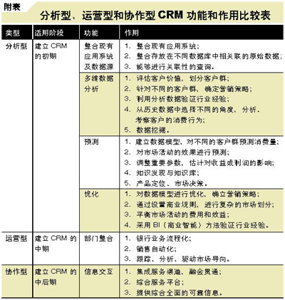 在上述目標(biāo)下,有什么類型的產(chǎn)品可供選擇呢?對銀行來說,有分析型、運營型和協(xié)作型3類CRM,而這3類CRM也有著很大差別,對于有不同需求的銀行需要有不同的選擇。下面詳細(xì)分析這3類CRM。