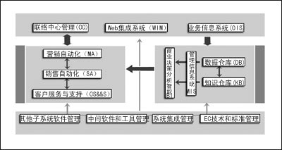 在信息技術(shù)管理子系統(tǒng)中,CRM的各功能模塊和相關(guān)系統(tǒng)運(yùn)行都必須由先進(jìn)的技術(shù)、設(shè)備、軟件來保障,主要的內(nèi)容可以分為以下四類:其他子系統(tǒng)應(yīng)用軟件管理,如數(shù)據(jù)庫管理系統(tǒng)、電子軟件分發(fā)系統(tǒng)等;中間軟件和系統(tǒng)工具的管理,如中間軟件系統(tǒng)、系統(tǒng)執(zhí)行管理工具等;企業(yè)級系統(tǒng)的集成管理,如CRM與企業(yè)管理信息系統(tǒng)的集成,乃至整個的企業(yè)應(yīng)用集成方案,以實現(xiàn)將企業(yè)的CRM與ERP、SCM等系統(tǒng)緊密集成;電子商務(wù)技術(shù)和標(biāo)準(zhǔn)的管理,如Internet技術(shù)、EDI技術(shù)及標(biāo)準(zhǔn)、通信標(biāo)準(zhǔn)的管理等。為支持無線應(yīng)用,CRM技術(shù)管理子系統(tǒng)將提供與手機(jī)、PDA、智能家電等工具的通訊接口,采用J2EE或.NET技術(shù)平臺,以及在支持無線傳輸和無線LAN應(yīng)用等方面進(jìn)行相應(yīng)的調(diào)整。