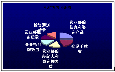 。。具筆者調(diào)查,現(xiàn)在對營業(yè)部盈利最大的是機(jī)構(gòu)客戶或者大額個人投資者,而隨著股市行情的低彌,他們在選取營業(yè)部的考慮因素主要關(guān)鍵點(diǎn)及其所占比例如下圖: