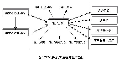 大多數(shù)CRM研究人員和應(yīng)用專家不認(rèn)為CRM存在作為應(yīng)用支撐的理論基礎(chǔ),充其量認(rèn)為CRM只是支持企業(yè)營銷的商業(yè)策略。隨著企業(yè)追求市場活動績效的熱情的提高,企業(yè)開始采用定性和定量的分析方法決策其與市場和客戶有關(guān)的企業(yè)活動,如有效的客戶滿意度評價(jià)、客戶分類、客戶盈利率分析等。而這些決策迫切需要相關(guān)的理論基礎(chǔ)為指導(dǎo),真正擺脫靠經(jīng)驗(yàn)進(jìn)行決策的做法。當(dāng)前CRM的理論研究和學(xué)術(shù)探討并未真正走向體系化、統(tǒng)一化,所以造成CRM市場中提供的功能參差不齊。CRM系統(tǒng)必須存在一個完整的理論體系為指導(dǎo),本文將CRM系統(tǒng)賴以存在的理論基礎(chǔ)統(tǒng)稱為客戶理論(Theory on Customer)。