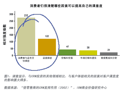 IBM商業(yè)價值研究中心的一項研究結果印證了筆者的設想。IBM 對美國10家零售商的消費群進行了調查,其中包括5家表現較好的(過去3年中在店面單位面積銷售和凈收入的增長方面做得很好)和5家表現較差的(業(yè)績持平或出現下滑)。調查發(fā)現,領先的零售商能夠同時有效使用關鍵的滿意度推動因素和關系要素,為消費者提供最佳的“總體體驗”,即一家公司(或一個品牌)有形、無形地給客戶留下的總體印象。該項調查的統(tǒng)計分析結果發(fā)現了5組滿意度推動因素: