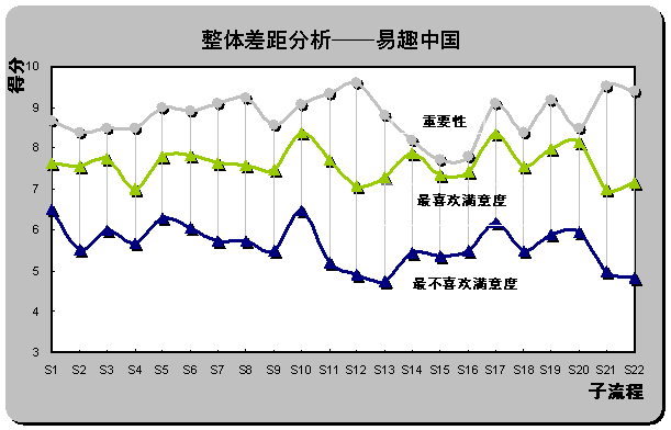 2) 重要流程欠缺最優(yōu)體驗。雖然易趣中國被認為是最不喜歡的在線銷售網(wǎng)站,但從滿意度評分也同時可以發(fā)現(xiàn),易趣中國在S1(瀏覽速度),S16(個人定制促銷信息的發(fā)布)和S15(個性化頁面設(shè)置)還是為用戶設(shè)計了相對較好的體驗。但重要性得分排名前三位的子流程中,S12(產(chǎn)品質(zhì)量可靠)、S21(退換貨服務(wù))和S22(客戶投訴和反饋)仍為重要性與滿意度差距最大的三個子流程,易趣中國也未在重要流程上為用戶設(shè)計優(yōu)越的在線體驗。
