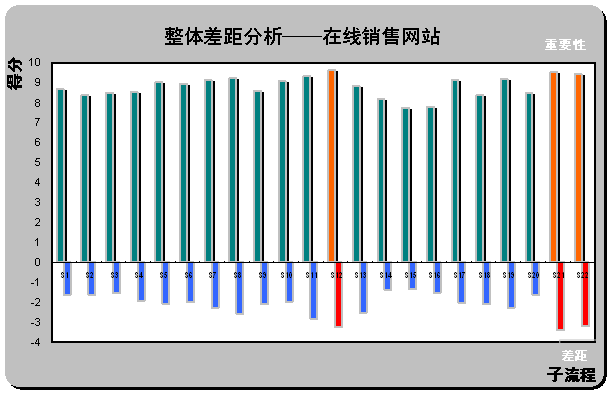 。2)整體差距分析(Gap Analysis)。請見上圖X軸下方所示,計算所有被調(diào)查對所列在線銷售網(wǎng)站的滿意度平均值(綜合最喜歡在線銷售網(wǎng)站和最不喜歡在線銷售網(wǎng)站的滿意度,計算被調(diào)查者對22個子流程的滿意度評分)。通過計算重要性和滿意度的差距,首先,一個有趣的現(xiàn)象,在著色的三個差距最大的子流程剛好也是重要性得分排名前三位的流程S12,